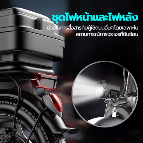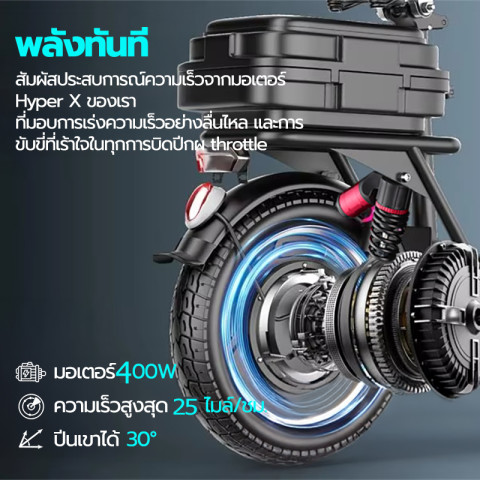มอเตอร์ 400W + แบตเตอรี่ลิเธียม 48V 16Ah ออกตัวดี ขี่ลื่นไหล ทำความเร็วได้ประมาณ 20–35 กม./ชม. (ขึ้นอยู่กับน้ำหนักผู้ขับ สภาพถนน และระดับแบตเตอรี่)