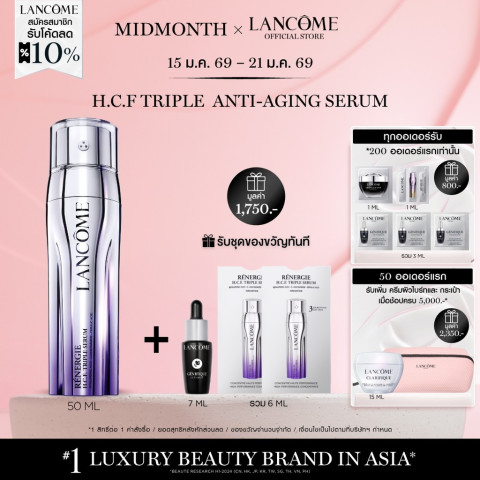 LANCOME RENERGIE H.C.F. TRIPLE SERUM 50 ML เซรั่มลักซ์ชัวรี่นวัตกรรม “ทริปเปิลโดส” ครั้งแรกของการผสาน 3 พลังบำรุงผิว ไว้ในขวดเดียว เพื่อการดูแลผิวแบบรอบด้านครบในขั้นตอนเดียว ช่วยให้ผิวดูอิ่มฟู เรียบเนียน ริ้วรอยแลดูจางลง พร้อมลดเลือนจุดด่างดำให้สีผิวดูสม่ำเสมอขึ้น เหมาะกับผู้ที่มองหาเซรั่มแอนตี้เอจจิ้งประสิทธิภาพสูงที่เห็นผลอย่างเป็นรูปธรรม