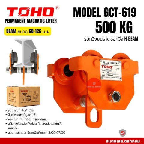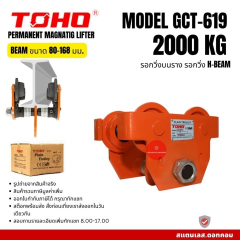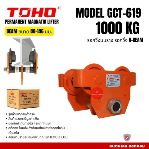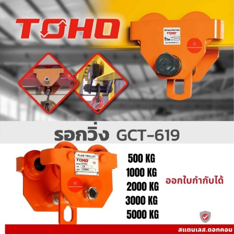TOHO รอกวิ่งบนราง รุ่น GCT619 (0.5 - 5 ตัน) อุปกรณ์ยก-เคลื่อนย้ายที่ออกแบบมาสำหรับงานอุตสาหกรรมและงานช่างที่ต้องการความคล่องตัวในการเลื่อนรอก/โซ่รอกไปตามคาน I-Beam ช่วยให้การยกของหนักเป็นไปอย่างราบรื่น ประหยัดแรง และเพิ่มความปลอดภัยในการทำงาน เหมาะสำหรับโรงงาน คลังสินค้า งานติดตั้งเครื่องจักร และงานซ่อมบำรุง