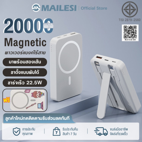พาวเวอร์แบงค์ไร้สาย 20000mAh ชาร์จเร็ว 22.5W Magnetic พร้อมขาตั้งแบบพกพา ตัวช่วยพลังงานสำหรับคนใช้มือถือหนักๆ ชาร์จได้ทั้งแบบไร้สายและเสียบสายในเครื่องเดียว จับติดด้วยแม่เหล็กเพื่อความสะดวกขณะใช้งาน เหมาะสำหรับพกไปทำงาน เดินทาง หรือใช้ระหว่างวันแบบไม่ต้องกังวลแบตหมด