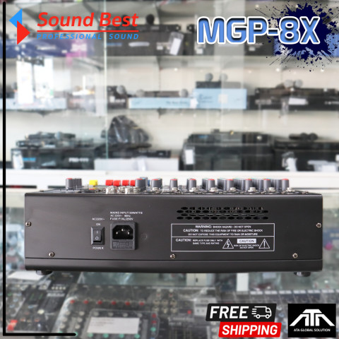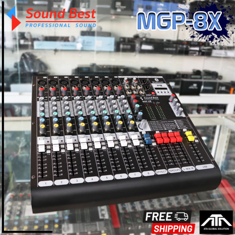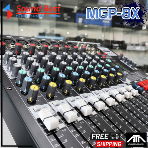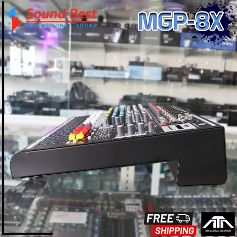 SoundBest MGP-8X MIXER มิกเซอร์ 8 ช่องขนาดกะทัดรัด ฟังก์ชันครบ ใช้งานได้ทั้งงานไลฟ์ งานซ้อม วงดนตรี ห้องซ้อม สตรีมมิ่ง หรือทำเสียงพูด/ร้อง เหมาะสำหรับผู้ที่ต้องการมิกซ์เสียงให้ชัด เจาะ และคุมบาลานซ์ได้ง่ายในเครื่องเดียว ด้วยเอฟเฟ็กต์ DSP ในตัวและรองรับไมโครโฟนหลายตัวพร้อมกัน