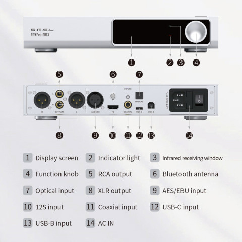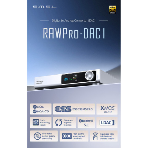 Smsl RAWPro-DAC1 DAC ระดับออดิโอไฟล์ที่ยกระดับคุณภาพเสียงจากทุกแหล่งสัญญาณให้คมชัด รายละเอียดครบ เวทีเสียงกว้าง และไดนามิกเร้าใจ ด้วยชิปเรือธง ES9039MSPro รองรับไฟล์ความละเอียดสูงสุด PCM 32Bit/768kHz และ DSD512 พร้อมความสามารถในการ ถอดรหัส MQA / MQA-CD เพื่อให้ได้คุณภาพเสียงใกล้เคียงต้นฉบับมากที่สุด อีกทั้งยังเชื่อมต่อไร้สายได้สะดวกด้วย Bluetooth 5.1 รองรับ LDAC สำหรับการฟังเพลง Hi-Res แบบไร้สาย และควบคุมการใช้งานได้ง่ายด้วย รีโมทคอนโทรล