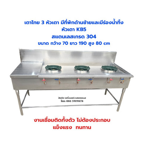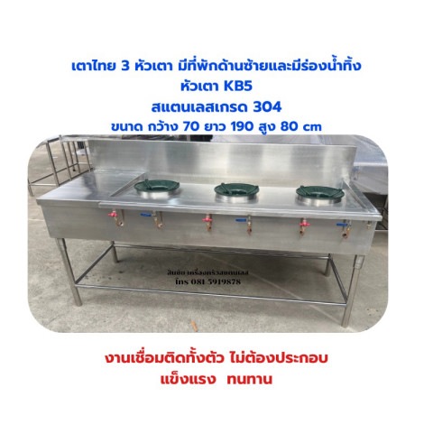 เตาไทย 3 หัวเตา พร้อมที่พักด้านซ้ายและร่องน้ำทิ้ง (สแตนเลสแท้เกรด 304) ราคา 24,000.00 บาท