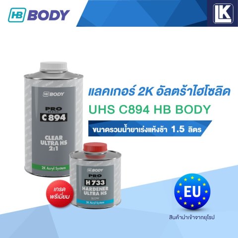 แลคเกอร์ 2K อัลตร้าไฮโซลิด UHS C894 HB BODY รวมน้ำยาเร่งแห้งช้า (H733) 1.5 ลิตร เกรดพรีเมี่ยม คือเคลียร์โค้ทคุณภาพสูงนำเข้าจากยุโรป สำหรับงานทำสีรถยนต์ที่ต้องการ “เงาลึกใส เนียนไหลตัวดี และทนทานยาวนาน” ด้วยสูตร Ultra High Solids ที่ให้การปกปิดดี ใช้ปริมาณน้อยกว่าแลคเกอร์ทั่วไป ช่วยประหยัดทั้งเวลาและต้นทุน เหมาะทั้งงานซ่อมเฉพาะจุดและพ่นรอบคัน