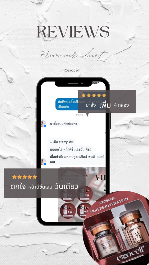 เพราะผิวที่ดีไม่ได้แค่บำรุงผิวด้านบน แต่ต้อง “ซ่อมผิวจากต้นตอ” ด้วยศาสตร์สเต็มเซลล์ Exocell ที่เน้นการฟื้นคืนสมดุลของผิว ช่วยให้ผิวดูแน่น กระชับ และเรียบเนียนขึ้นอย่างเป็นธรรมชาติ จึงเป็นเหตุผลที่หลายคนยอมบินไปทำที่เกาหลีในราคาหลักแสน—เพื่อผลลัพธ์งานผิวที่ดูเด็กลงและดูสุขภาพดีจริง