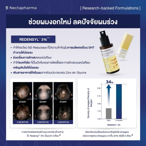 Redensyl 3% (สารสกัดจากพืชตระกูลสน) ช่วยลดการทำงานของ 5α-Reductase, ลดการอักเสบ และช่วยเติมสารอาหารให้เส้นผมจาก Zinc & Glycine