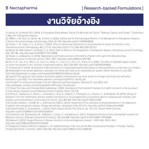 งานวิจัยรองรับผลลัพธ์: งานวิจัยที่ตีพิมพ์ใน Journal of Cosmetology & Trichology พบว่า 88.9% ของผู้ใช้สูตรผสม Redensyl + Capixyl + Procapil ต่อเนื่อง 24 สัปดาห์ มีการเปลี่ยนแปลงที่ดีขึ้นจากภาพก่อน–หลัง (เทียบกับกลุ่ม Minoxidil ที่ 60%)