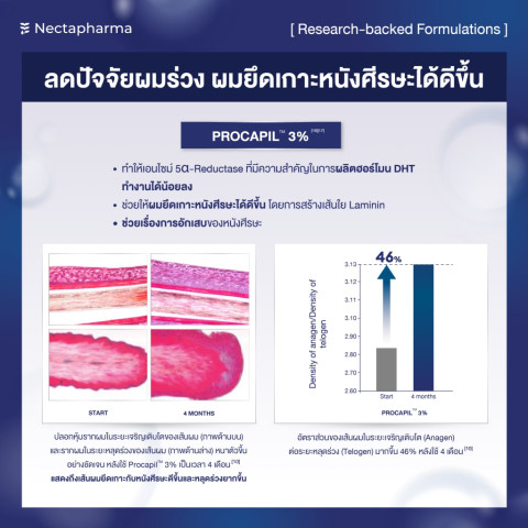 Procapil 3% (สารสกัดจากใบมะกอก) ช่วยลดการทำงานของ 5α-Reductase และช่วยให้ผมยึดเกาะหนังศีรษะดีขึ้นผ่านการสร้างเส้นใย Laminin