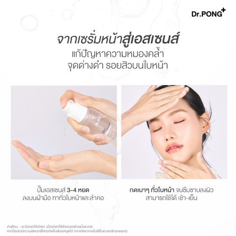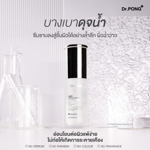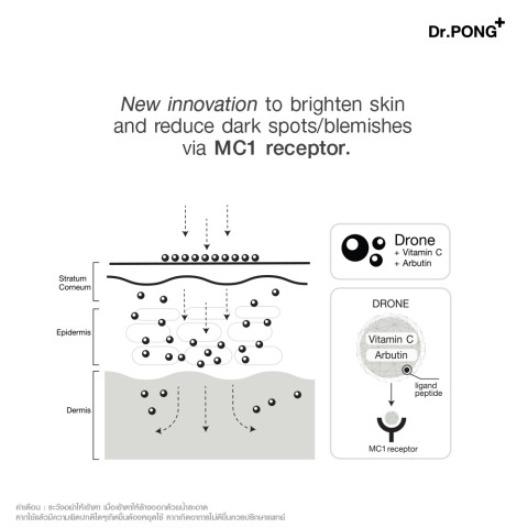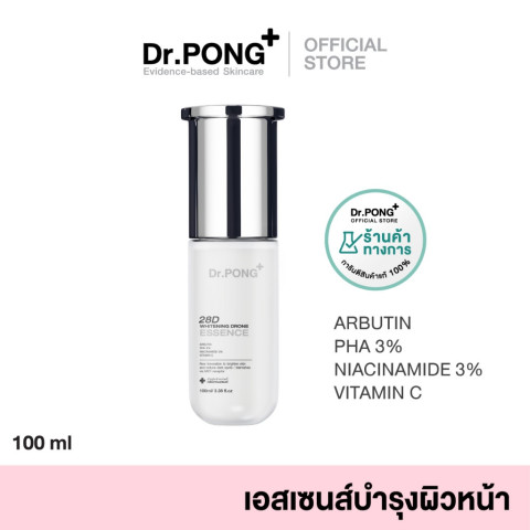 Dr.PONG 28D WHITENING DRONE ESSENCE เอสเซนส์เพื่อผิวดูกระจ่างใส ลดความหมองคล้ำ จุดด่างดำ และรอยสิว ด้วยการผสาน Niacinamide + Vitamin C + Arbutin + PHA พร้อมเทคโนโลยี Whitening Drone ที่ช่วยนำพาสารสำคัญให้ทำงานได้ “ตรงจุด” มากขึ้น โดยมุ่งเป้าไปที่ MC1 receptor ในเซลล์สร้างเม็ดสี (melanocyte) เพื่อช่วยลดการเกิดเม็ดสีที่ทำให้ผิวดูหมองคล้ำอย่างมีประสิทธิภาพ เหมาะสำหรับผู้ที่ต้องการผิวใสขึ้นแบบเป็นขั้นตอนและดูสม่ำเสมอขึ้นเมื่อใช้อย่างต่อเนื่อง