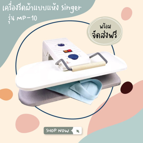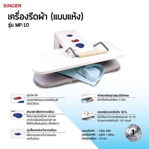 [พร้อมส่ง] SINGER เครื่องรีดผ้ากดทับแบบแห้ง รุ่น MP-10 เครื่องรีดผ้าพื้นที่ใหญ่กว่าเตารีดธรรมดาถึง 10 เท่า ช่วยให้ผ้าเรียบไว งานเนี้ยบ ประหยัดแรงและเวลา เหมาะทั้งงานรีดเสื้อผ้าทั่วไป ไปจนถึงเสื้อพิมพ์ลายและเสื้ออัดกาว พร้อมความปลอดภัยด้วยระบบปิดอัตโนมัติ และรับประกันศูนย์ไทย 1 ปี