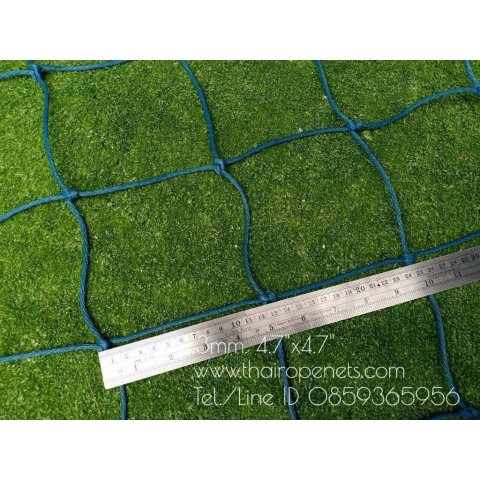 ตาข่ายผลิตจากเชือกเกลียวหนาพิเศษขนาด 3 มม. อัดแน่นทนแรงดึงสูง ผสมสารกันยูวี (UV Protection) ช่วยลดการเสื่อมสภาพจากแสงแดด ทำให้ใช้งานกลางแจ้งได้ยาวนาน สีฟ้าอมเขียวช่วยเพิ่มความโดดเด่นให้สนาม ดูสปอร์ตและเข้ากับบรรยากาศการเล่นกีฬา ลูกฟุตบอลไม่หลุดลอดออกแน่นอนด้วยช่องตาขนาด 12 x 12 ซม. และมีเชือกไนลอนขอบขนาด 8 มม. ร้อยรอบด้าน เพิ่มความแข็งแรงและช่วยให้ติดตั้งง่ายขึ้น