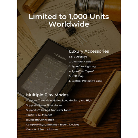 Musehifi M6 Double JAN 6418 + IN-17 คือ DAC และเครื่องขยายเสียงหูฟังแบบพกพา HiFi ระดับเรือธงที่ออกแบบมาสำหรับนักฟังที่ต้องการทั้งคุณภาพเสียงสุดประณีตและงานออกแบบที่โดดเด่นไม่เหมือนใคร รุ่นนี้ผลิตแบบลิมิเต็ด จำกัดเพียง 1,000 เครื่องทั่วโลก ยกระดับชุดฟังเพลงของคุณให้กลายเป็นงานศิลปะเคลื่อนที่ด้วยหลอดสุญญากาศและจอแสดงผล Nixie สุดไอคอนิก