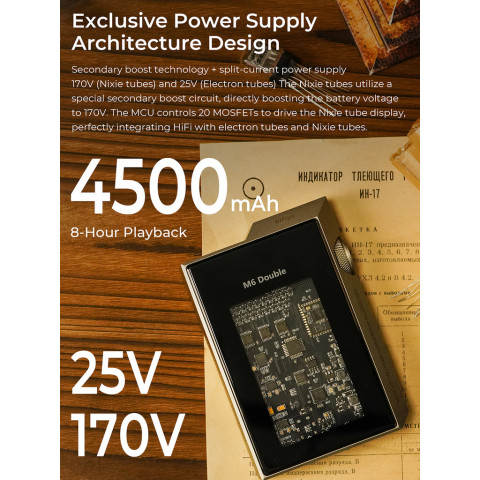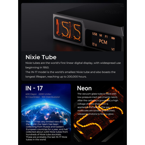จุดเด่นของ Musehifi M6 Double คือการผสานเทคโนโลยีดิจิทัลและอนาล็อกเข้าด้วยกันอย่างลงตัว ด้านหน้าตัวเครื่องมาพร้อมหลอด Neon Nixie IN-7 ที่ให้เอฟเฟกต์การแสดงผลตัวเลขและสถานะการทำงานแบบคลาสสิก ในขณะที่ภายในใช้หลอดสุญญากาศขนาดเล็กเกรดทหาร JAN6418 แบบคู่สำหรับภาคขยายสัญญาณเสียง ให้ลายเซ็นเสียงที่อุ่น ละเอียด และมีมิติแบบ “หลอดแท้” ในขนาดที่พกพาได้สะดวก