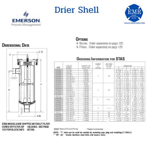 EMERSON (อีเมอร์สัน) ไดเออร์เชลล์ DRIER SHELL ขนาด 7/8" รุ่น STAS-487T (1 CORE) เป็นปลอกกรองไดเออร์คุณภาพสูงสำหรับระบบทำความเย็นและปรับอากาศ ออกแบบมาเพื่อใช้กรองความชื้นและสิ่งแปลกปลอมในระบบน้ำยา ช่วยยืดอายุการใช้งานของคอมเพรสเซอร์ วาล์ว และอุปกรณ์ต่าง ๆ ในวงจรความเย็นได้อย่างมีประสิทธิภาพ เหมาะสำหรับงานติดตั้งใหม่และงานซ่อมระบบที่ต้องการความน่าเชื่อถือในระดับมืออาชีพ