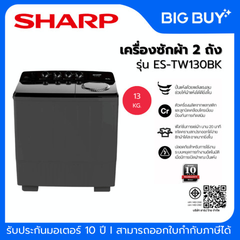 SHARP เครื่องซักผ้า 2 ถัง รุ่น ES-TW130BK (13 KG) ตัวช่วยซักผ้าคู่บ้านที่ตอบโจทย์ทั้งความจุและความทนทาน ใช้งานง่าย ซักสะอาดทั่วถึง พร้อมระบบดูแลความสะอาดภายในถัง ลดกลิ่นอับ เหมาะสำหรับครอบครัวที่ซักผ้าบ่อย หรือมีผ้าชิ้นใหญ่เป็นประจำ ในราคา 6,690.00 บาท