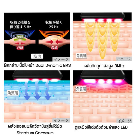 4-in-1 ขุมพลังแน่นในเครื่องเดียว: RF (คลื่นวิทยุ) + EMS (กระตุ้นกล้ามเนื้อ) + LED (แสงบำรุงผิว) + Ion (ไอออนช่วยผลักสารบำรุง)