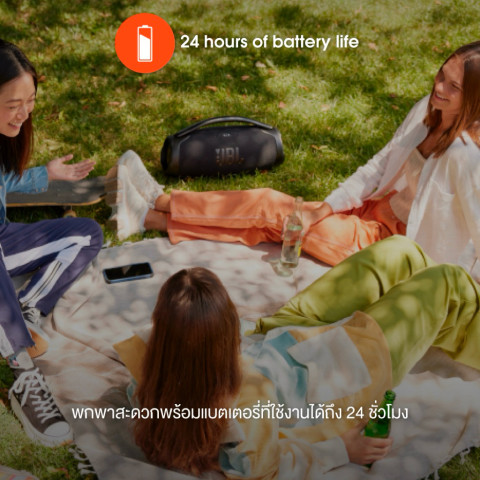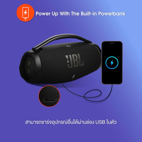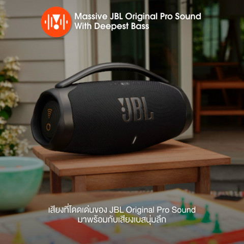JBL Boombox3 Wi‑Fi ลำโพงบลูทูธพกพาระดับพรีเมียม ที่ให้พลังเสียงอันเป็นเอกลักษณ์ของ JBL Original Pro Sound พร้อมเบสแน่นลึก ฟังสนุกได้ทุกแนวเพลง ไม่ว่าจะใช้งานในบ้านหรือพกพาออกไปทริปก็เอาอยู่ ด้วยดีไซน์กะทัดรัดจับถือสะดวก แถมอึดทนด้วยมาตรฐานกันน้ำกันฝุ่น IP67 ใช้งานได้มั่นใจทุกสภาพแวดล้อม