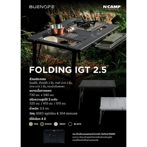 ❗️พร้อมส่ง❗️ 🇰🇷 BUENOFE New IGT Camping Table 2.5 UNIT (Olive) โต๊ะแคมป์ปิ้งอเนกประสงค์ระดับพรีเมียม ดีไซน์เรียบเท่ โทนสี Olive ใช้งานได้ทั้งสายแคมป์และสายทำครัวกลางแจ้ง รองรับระบบ IGT แบบ 2.5 ยูนิต จัดวางอุปกรณ์ได้เป็นระเบียบ เพิ่มพื้นที่ทำอาหาร/เตรียมของให้คล่องตัวในทุกทริป