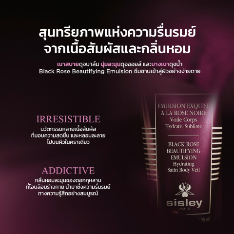 Sisley Black Rose Beautifying Emulsion 200ml อีมัลชั่นบำรุงผิวกายเนื้อบางเบา ซึมไว มอบความชุ่มชื้นยาวนาน ช่วยให้ผิวดูเรียบเนียน นุ่มเด้ง และเปล่งปลั่งอย่างเป็นธรรมชาติ พร้อมกลิ่นหอมละมุนสไตล์กุหลาบดำอันเป็นเอกลักษณ์ เหมาะสำหรับผู้ที่ต้องการยกระดับการบำรุงผิวกายให้ดูสวยสุขภาพดีในทุกวัน