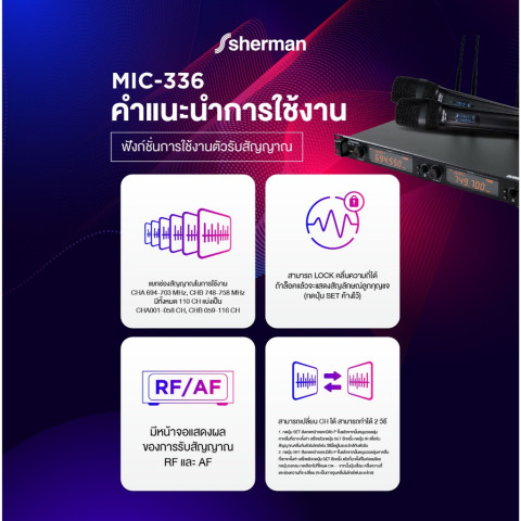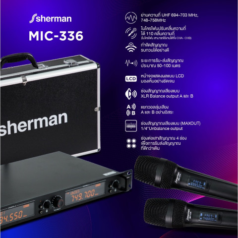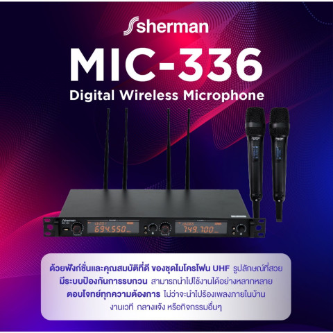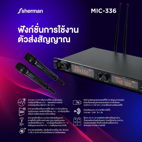 Sherman ชุดไมโครโฟนไร้สาย UHF รุ่น MIC-336 ตัวช่วยยกระดับทุกการใช้งานเสียงให้คมชัดและเป็นมืออาชีพ ด้วยชุดไมค์ลอยแบบมือถือไมค์คู่ (2 ไมค์) ดีไซน์สวย ใช้งานง่าย พร้อมระบบป้องกันสัญญาณรบกวนและปรับคลื่นความถี่ได้มากถึง 110 ช่อง เหมาะทั้งร้องเพลงที่บ้าน งานเวที งานอีเวนต์ กลางแจ้ง ไปจนถึงกิจกรรมที่ต้องการความคล่องตัวและความเสถียรของสัญญาณ