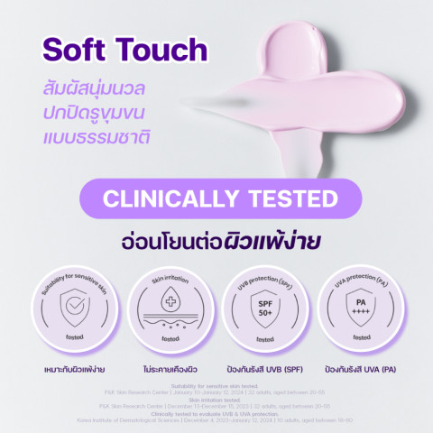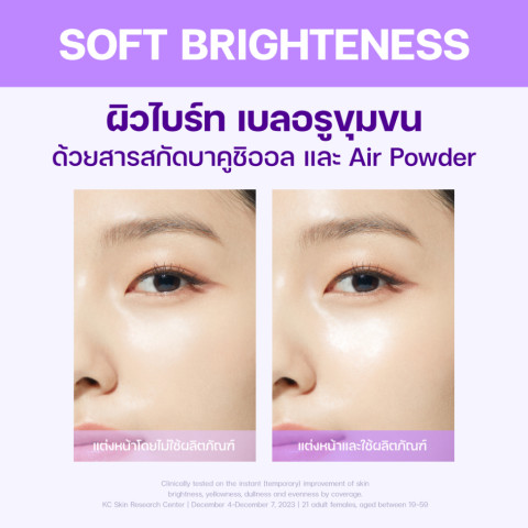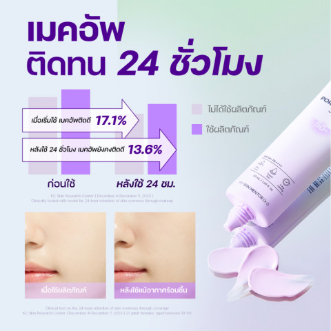 โทนสีม่วงช่วยกระจายแสง ลดความเหลืองของผิว ให้ผิวดูไบรท์แบบเป็นธรรมชาติ และผ่านการทดสอบว่าช่วยให้เมคอัพติดทนนานได้ถึง 24 ชั่วโมง แม้อากาศร้อนชื้นเบลอรูขุมขน & ช่วยให้ผิวดูแน่นกระชับ