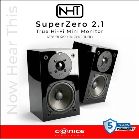 NHT SuperZero 2.1 Mini-Monitor Speaker ลำโพงบุ๊คเชลล์ 2 ทางแบบ ตู้ปิด (Acoustic Suspension / Sealed) ขนาดกะทัดรัดแต่ให้เสียงระดับไฮเอนด์ โดดเด่นด้วยความโปร่ง รายละเอียดครบ และโฟกัสเวทีเสียงแบบ “เหมือนเดินวนอยู่บนสเตจ” เหมาะทั้งฟังเพลงจริงจังและจัดชุดโฮมเธียเตอร์ที่ต้องการเสียงกลาง-แหลมคมชัดเป็นธรรมชาติ