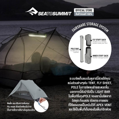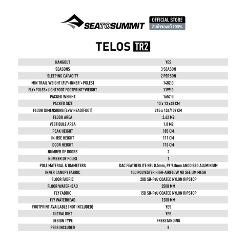 Sea to Summit TELOS TR2 Ultralight Backpacking Tent เต็นท์แบ็คแพ็ค 2 คนระดับพรีเมียม ที่ออกแบบมาเพื่อให้ “อยู่สบาย” กว่าเต็นท์น้ำหนักเบาทั่วไป ด้วยสถาปัตยกรรม Tension Ridge ที่จดสิทธิบัตร เพิ่มพื้นที่ใช้สอย ความสูงภายใน และการระบายอากาศแบบเหนือชั้น เหมาะทั้งทริปเดินป่า ไต่เขา แคมป์ปิ้งที่ต้องการความเบา แต่ยังอยากได้ความโปร่ง โล่ง และกางง่าย