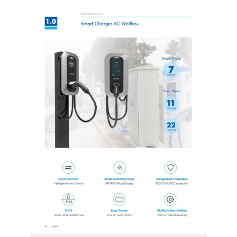 CHINT EV NTW-EC2A7W1 LCBWS 7kW 1P 32A เครื่องชาร์จรถยนต์ไฟฟ้าแบบติดผนัง (Wallbox) ดีไซน์แข็งแรง ใช้งานง่าย พร้อมฟังก์ชันอัจฉริยะสำหรับบ้านและอาคาร รองรับการชาร์จได้สูงสุด 7kW (1 เฟส 32A) ช่วยให้การชาร์จสะดวก ปลอดภัย และควบคุมได้ผ่านแอป พร้อมการป้องกันครบสำหรับการใช้งานจริงทั้งในและนอกอาคาร