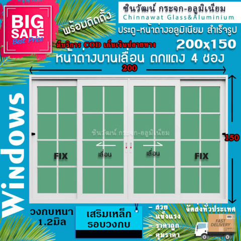 หน้าต่างบานเลื่อนอลูมิเนียม 4 ช่อง ขนาด 200x150 ซม. ลายลูกฟัก จากร้าน ชินวัฒน์ กระจกอลูมิเนียม งานสำเร็จรูปพร้อมติดตั้ง ช่วยเติมแสงและลมให้บ้านโปร่งสบาย พร้อมเสริมเหล็กรอบวงกบเพิ่มความแข็งแรง เหมาะกับงานต่อเติมบ้าน งานรีโนเวท หรือทำช่องหน้าต่างใหม่ให้จบไวและสวยเรียบร้อย