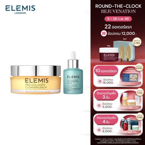 Elemis Pro-Collagen Future Restore Serum 30ml. & Cleansing Balm 100g. เซตดูแลผิวครบขั้นตอนสำหรับผิวที่ต้องการความกระชับและผิวดูเรียบเนียนขึ้น เริ่มจากการทำความสะอาดอย่างอ่อนโยนด้วยบาล์มเนื้อเนียนนุ่ม แล้วตามด้วยเซรั่มบำรุงเข้มข้น ช่วยให้ผิวดูยืดหยุ่น ดูอิ่มฟู และริ้วรอยแลดูลดลงอย่างเป็นธรรมชาติ เหมาะสำหรับผู้ที่มองหาเซตดูแลผิวระดับพรีเมียมในชุดเดียว