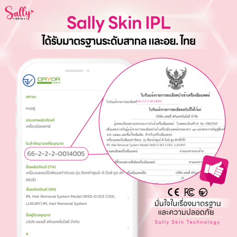 ได้รับมาตรฐานระดับสากล และผ่าน อย. ไทย (เลขที่จดแจ้ง : 66-2-2-2-0014005) พร้อมระบบ Skin Touch Sensor เครื่องจะปล่อยแสงเมื่อแนบผิวเท่านั้น ช่วยเพิ่มความปลอดภัยในการใช้งาน