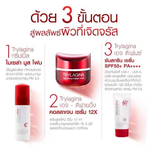 Trylagina 12X Collagen Serum ไตรลาจิน่า 12X คอลลาเจนเซรั่ม ขนาด 30 กรัม (แพ็ก 2 กระปุก) ราคา 7,000.00 บาท เซรั่มคอลลาเจนสูตรใหม่ที่พัฒนาดียิ่งขึ้น 12 เท่า* เพื่อมอบ “The Sense of Youth Infinity” รู้สึกถึงความอ่อนเยาว์ไม่มีที่สิ้นสุด ฟื้นบำรุงล้ำลึกถึง 5 มิติ ช่วยให้ผิวดูอ่อนเยาว์ กระชับ ชุ่มชื้น และกระจ่างใสอย่างเป็นธรรมชาติ