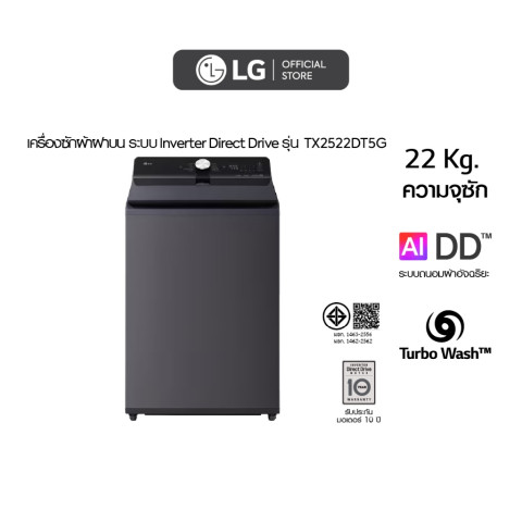 LG เครื่องซักผ้าฝาบน 22 กก. รุ่น TX2522DT5G พลังซักจุใจสำหรับบ้านที่ซักผ้าปริมาณมาก จัดการผ้าหนาอย่างผ้าห่มหรือชุดทำงานได้สบาย ด้วยมอเตอร์ Inverter Direct Drive ที่ทำงานเสถียร เสียงรบกวนน้อย และเสริมความฉลาดด้วย ThinQ (Wi‑Fi) ให้คุณควบคุมและตรวจสอบสถานะได้จากสมาร์ทโฟน