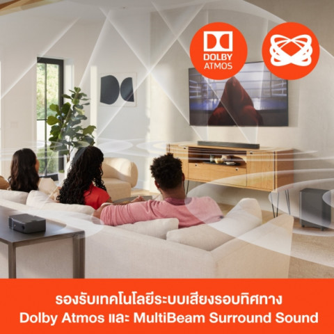 สัมผัสเสียงพาโนรามาที่เหนือกว่า ด้วยเทคโนโลยี MultiBeam ผสานมาตรฐานเสียงภาพยนตร์อย่าง Dolby Atmos และ DTS:X ให้รายละเอียดครบทั้งเสียงเอฟเฟกต์ เสียงดนตรี และเสียงพูด พร้อมพลังขับรวมสูงสุด 880W ตอบโจทย์ทั้งห้องนั่งเล่นและโฮมเธียเตอร์แบบไม่ต้องเดินสายให้ยุ่งยาก