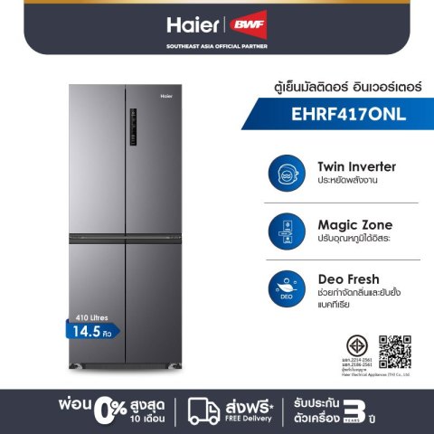 Haier ตู้เย็นมัลติดอร์ อินเวอร์เตอร์ 14.5 คิว รุ่น EHRF417ONL ดีไซน์พรีเมียมสีเงิน Stellar Silver มาพร้อมระบบทำความเย็นกระจายรอบทิศทางและฟังก์ชันดูแลความสด ช่วยให้จัดเก็บอาหารเป็นสัดส่วน หยิบใช้ง่าย และคงความสดได้ยาวนาน เหมาะสำหรับครอบครัวที่ต้องการตู้เย็นความจุใหญ่ ประหยัดไฟ และทำงานเงียบ