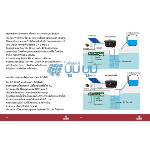 หมายเหตุ: การเลือกปั๊มให้เหมาะสมควรคำนึงจาก ระยะหย่อน และ ปริมาณน้ำ เป็นหลัก โดยความแรงของน้ำยังขึ้นอยู่กับ จำนวนแผง และ วัตต์ของแผง ที่ใช้ร่วมกัน