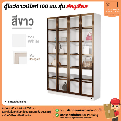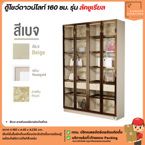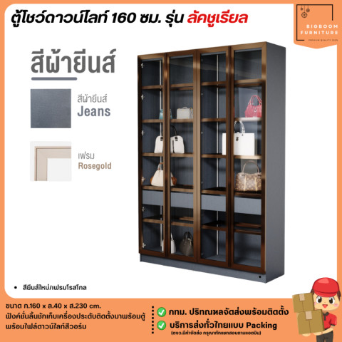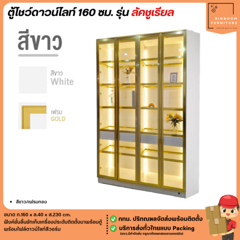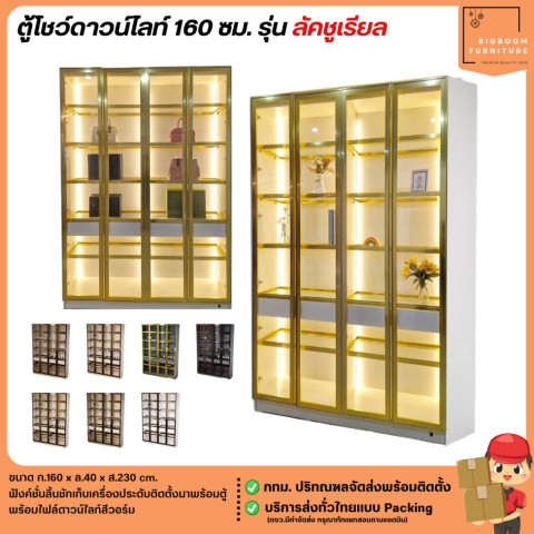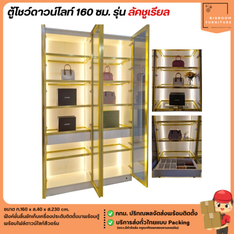 ตู้โชว์ดาวน์ไลท์ 160 ซม. รุ่น ลัคชูเรียล จากบิ๊กบูมเฟอร์นิเจอร์ ยกระดับมุมโชว์ให้ดูหรูหราโดดเด่น ด้วยดีไซน์สียีนส์ใหม่ตัดกับเฟรมทอง เพิ่มความพรีเมียมให้บ้านหรือหน้าร้าน พร้อมไฟดาวน์ไลท์โทนวอร์มที่ช่วยขับความสวยของเครื่องประดับ ของสะสม หรือสินค้าจัดแสดงให้ดูมีมิติและน่าหยิบจับมากขึ้น