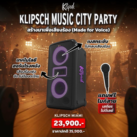 หากคุณกำลังมองหาลำโพงปาร์ตี้ที่ให้ทั้งพลังเสียง แสงสี ความทนทาน และฟีเจอร์ครบสำหรับดีเจ คาราโอเกะ และปาร์ตี้ทุกรูปแบบ Klipsch Miami Music City Party Speaker คือคำตอบเดียวที่คุณต้องมีไว้ในงานของคุณ