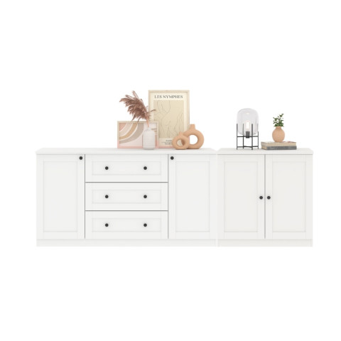 ชุดนี้ประกอบด้วยตู้เตี้ย 2 ใบ ขนาดรวม 230 ซม. พร้อมลิ้นชักและบานเปิดสำหรับจัดเก็บของได้อย่างเป็นระบบ ช่วยประหยัดพื้นที่ ทำให้ห้องดูโล่งและมีสไตล์ ด้วยโทนสีขาวเคลือบมันเงา ให้ความรู้สึกทันสมัย สะอาดตา และเข้าได้กับเฟอร์นิเจอร์ทุกรูปแบบ