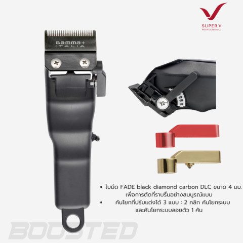 ปัตตาเลี่ยนไร้สาย GAMMA+ BOOSTED จากแบรนด์ระดับโปร นำเข้าโดยบริษัท Super V Inter ของแท้ 100% ออกแบบมาเพื่อตอบโจทย์ช่างตัดผมมืออาชีพและสายแต่งผมจริงจัง มาพร้อมพลังมอเตอร์จัดเต็ม แบตเตอรี่ใช้งานยาวนาน และดีไซน์ตัวเครื่องแบบโมดูลาร์ที่เปลี่ยนฝาครอบได้ 3 สีในชุดเดียว ช่วยให้คุณปรับลุคเครื่องมือให้เข้ากับสไตล์ร้านหรือคาแรคเตอร์ของคุณได้อย่างลงตัว
