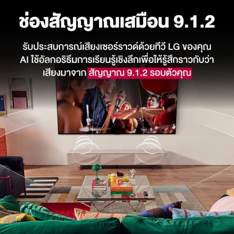 ด้านเสียงมาพร้อม AI Sound Pro (Virtual 9.1.2) และกำลังขับเสียง 20W ให้เสียงกระจายรอบทิศทาง ชัดใส มีมิติ เสริมด้วยฟีเจอร์ Clear Voice Pro ทำให้เสียงพูดคมชัด ไม่กลบด้วยเอฟเฟกต์เสียงอื่นๆ และยังรองรับ LG Sound Sync สำหรับเชื่อมต่อกับ Soundbar หรือลำโพง LG ได้ง่ายดายทั้งผ่าน HDMI eARC และ Bluetooth