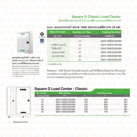 ตู้โหลดเซ็นเตอร์ เฟรม100 3เฟส 4สาย 24ช่อง แบบใช้กับเมนเบรกเกอร์ ชไนเดอร์ รุ่นคลาสสิค QO3-100EZ24G/SN Schneider ราคา 7,350.00 บาท (ราคานี้ไม่รวมเมนเบรกเกอร์)