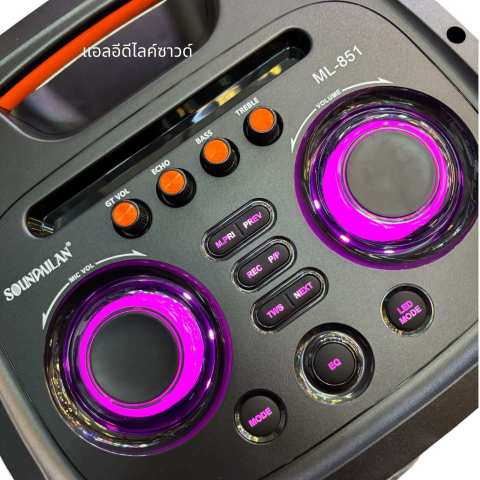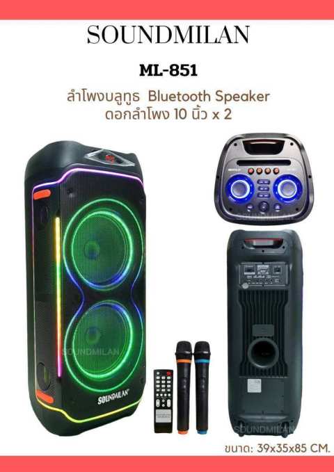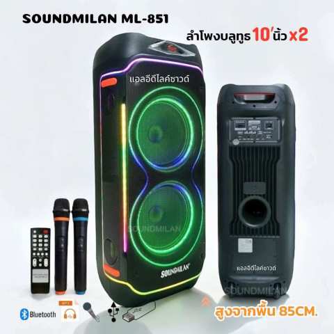 ลำโพงบลูทูธ SOUNDMILAN รุ่น ML-851 ขนาด 10 นิ้ว 2 ดอก (10 นิ้วเบิ้ล) ลำโพงพกพาพลังเสียงจัดเต็ม เบสแน่น กระหึ่มสะใจ เหมาะทั้งงานปาร์ตี้ ร้องคาราโอเกะ งานกิจกรรม หรือเปิดเพลงในบ้าน มาพร้อมไมค์ลอย 2 ตัว ให้คุณสนุกกับการร้องเพลงได้ทันที และมีแบตเตอรี่ในตัว ใช้งานสะดวก ไม่ต้องเสียบปลั๊กตลอดเวลา