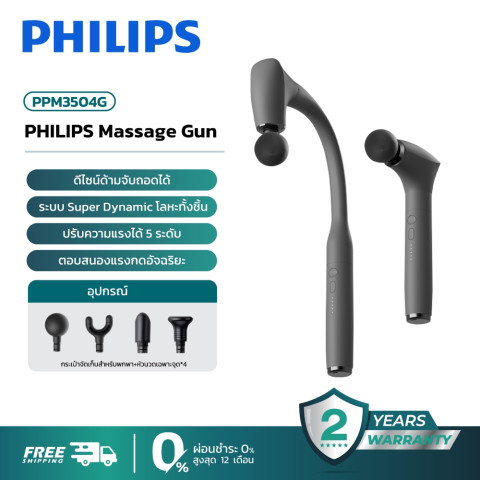Philips เครื่องนวดมือถือ Massage Gun Fascia Gun รุ่น PPM3504G/PPM7332 ปืนนวดไฟฟ้าสำหรับคลายกล้ามเนื้อ ช่วยบรรเทาความตึงล้าได้อย่างตรงจุด เหมาะทั้งหลังออกกำลังกาย นั่งทำงานนาน หรือผู้ที่ต้องการผ่อนคลายระหว่างวัน ด้วยดีไซน์จับถนัดมือและด้ามจับถอดออกได้ ใช้งานสะดวกและพกพาง่าย เป็นตัวเลือกที่เหมาะสำหรับดูแลตัวเองหรือมอบเป็นของขวัญ
