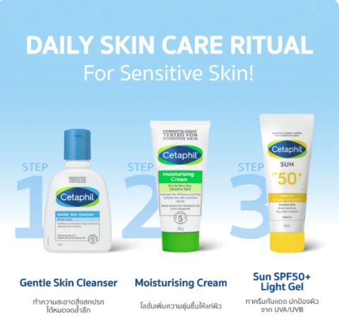 ทาครีมบำรุงผิว Cetaphil Moisturising Cream บนผิวหน้าและผิวกายเป็นประจำ เช้า–เย็น หรือบ่อยเท่าที่ต้องการ โดยเน้นบริเวณที่แห้งเป็นพิเศษ