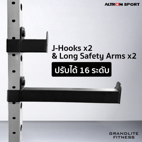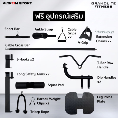 อุปกรณ์เสริมพร้อมใช้: dip handles, long safety arms, J-hooks, plate holders, foot plate, landmine/T-bar rows, safety locks, cable grips, squat pad