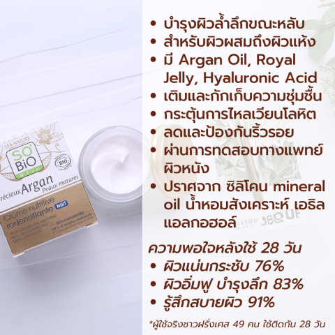เนื้อครีมเข้มข้น ซึมซาบง่าย ไม่เหนียวเหนอะหนะ ผสานพลังจาก น้ำมันอาร์แกนบริสุทธิ์ (Argan Oil) และ Royal Jelly ที่ช่วยฟื้นบำรุงผิวขณะคุณหลับ ให้ตื่นมาพร้อมผิวที่ดูฟู อิ่มน้ำ แน่น กระชับ และเรียบเนียนขึ้นอย่างเห็นได้ชัด