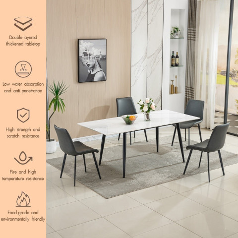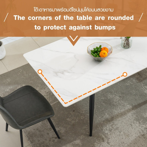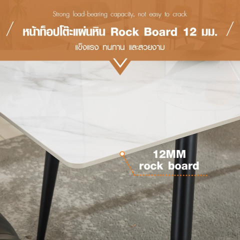 หน้าท็อปโต๊ะลายหินอ่อนผลิตจาก Rock Board หนา 1.2 ซม. ให้สัมผัสสวยหรูเหมือนหินธรรมชาติ แต่แข็งแรงกว่า ทนรอยขีดข่วนได้ดี ไม่เป็นรอยง่ายแม้ใช้งานทุกวัน ทนความร้อนสูง สามารถวางหม้อหรือจานอาหารร้อนได้อย่างมั่นใจ อีกทั้งยังไม่ดูดซึมน้ำและน้ำมัน ทำให้ไม่เกิดคราบฝังแน่น ทำความสะอาดง่าย เพียงใช้ผ้าชุบน้ำหมาดเช็ดก็กลับมาดูใหม่เงางามอยู่เสมอ