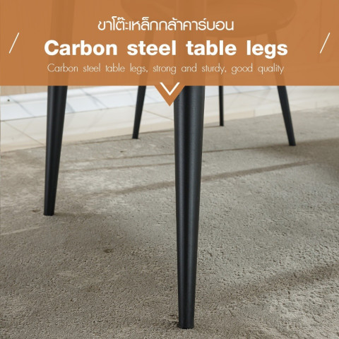 โครงขาโต๊ะผลิตจากเหล็กคาร์บอน (Carbon Steel) ดีไซน์เรียบ มินิมอล แต่แข็งแรงทนทาน รองรับน้ำหนักได้สูงสุดถึง 100 กก. โครงสร้างมั่นคง ไม่โยกง่าย และให้ความรู้สึกโปร่ง โล่ง สบายตา เข้ากับสไตล์การแต่งบ้านหลากหลาย ทั้งแนวโมเดิร์น มินิมอล หรือสแกนดิเนเวียน