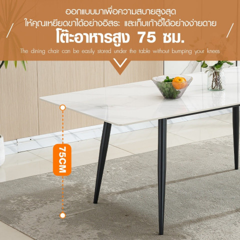 ด้วยขนาดโต๊ะ 90x160x75 ซม. ชุดนี้รองรับการใช้งานแบบ 4 ที่นั่งได้อย่างสบาย จัดวางจาน ชาม หม้อเสิร์ฟ และของตกแต่งโต๊ะได้พอดีลงตัว เหมาะสำหรับครอบครัวเล็ก คู่รัก หรือใช้เป็นมุมรับรองเพื่อนในโอกาสพิเศษ เติมบรรยากาศให้มื้ออาหารดูอบอุ่นและหรูหราขึ้นทันที